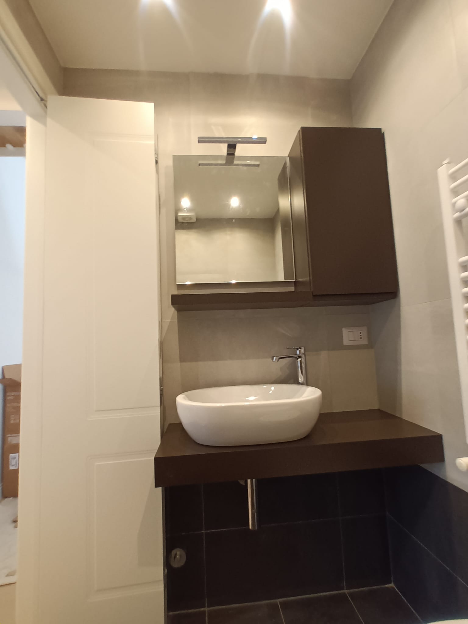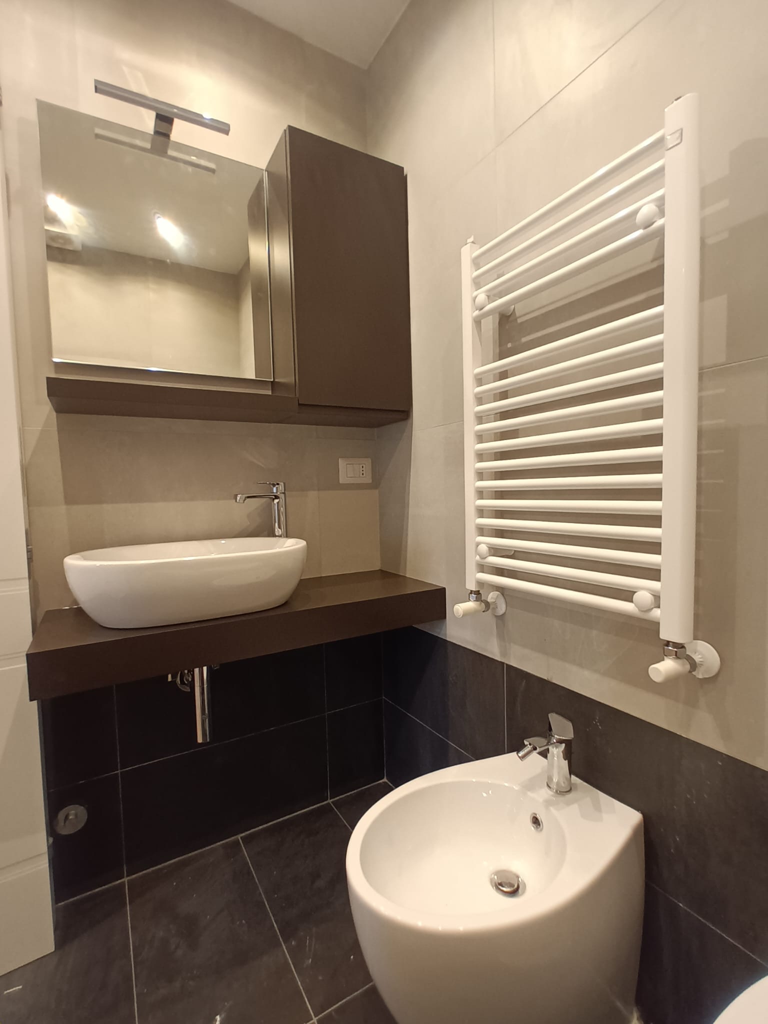 Il lavabo da appoggio su mensola marrone scuro si accompagna a un mobile contenitore e uno specchio retroilluminato, che aggiungono funzionalità senza appesantire. Il termoarredo bianco, discreto ma efficiente, contribuisce al comfort senza spezzare la continuità cromatica.