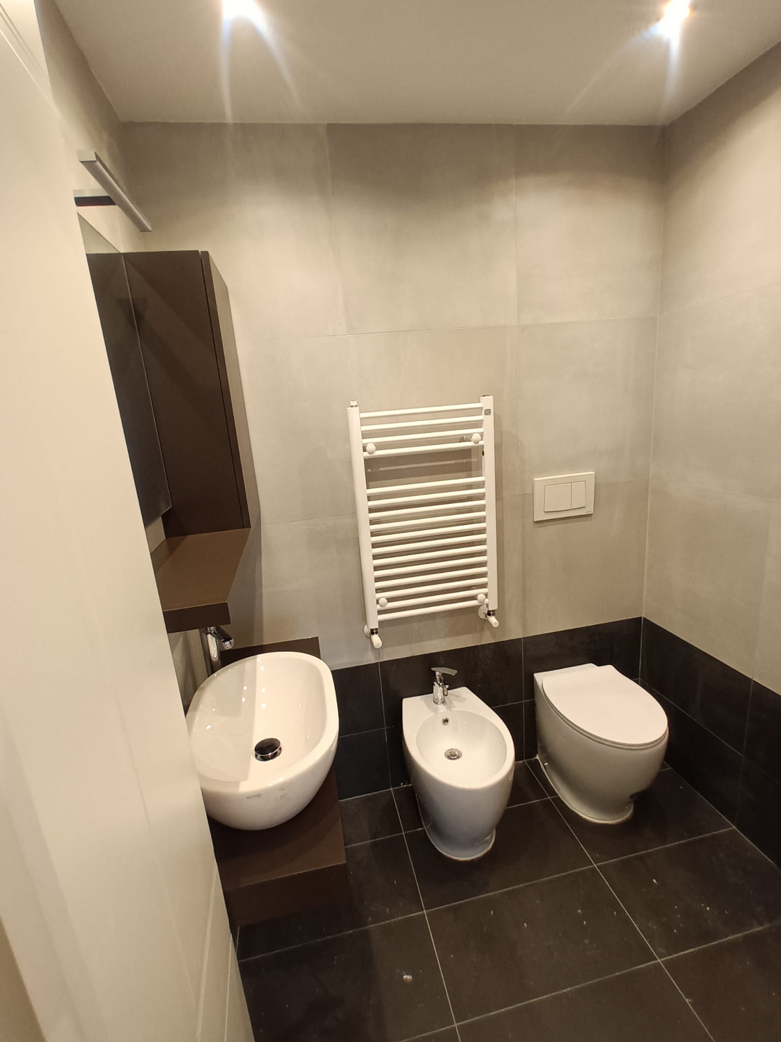 Il pavimento è in gres porcellanato scuro, effetto pietra lavica, scelto per dare profondità e coerenza stilistica. Le pareti sono rivestite in un tono più chiaro, effetto cemento, che dialoga armoniosamente con la base scura e aiuta a dilatare visivamente lo spazio.