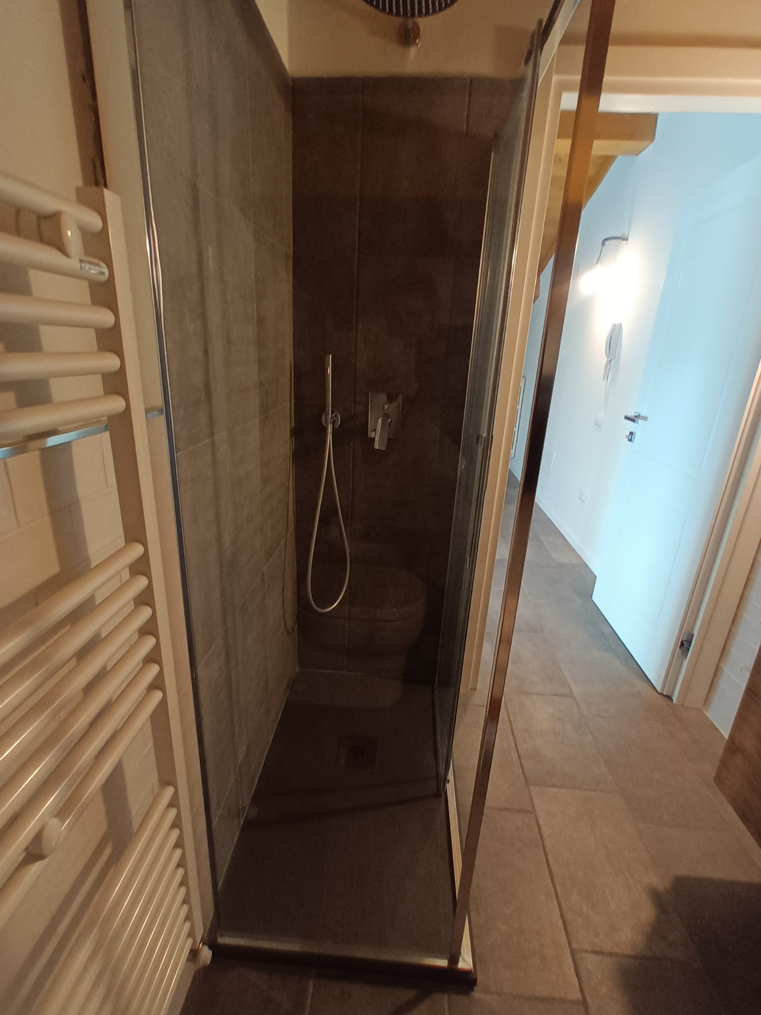 La doccia walk-in è definita da un rivestimento a tutta altezza in gres scuro e da una parete in vetro, soluzione che consente un’ottima resa estetica e praticità di utilizzo. Il soffione a pioggia e la rubinetteria cromata completano l’opera con un tocco moderno e minimalista.