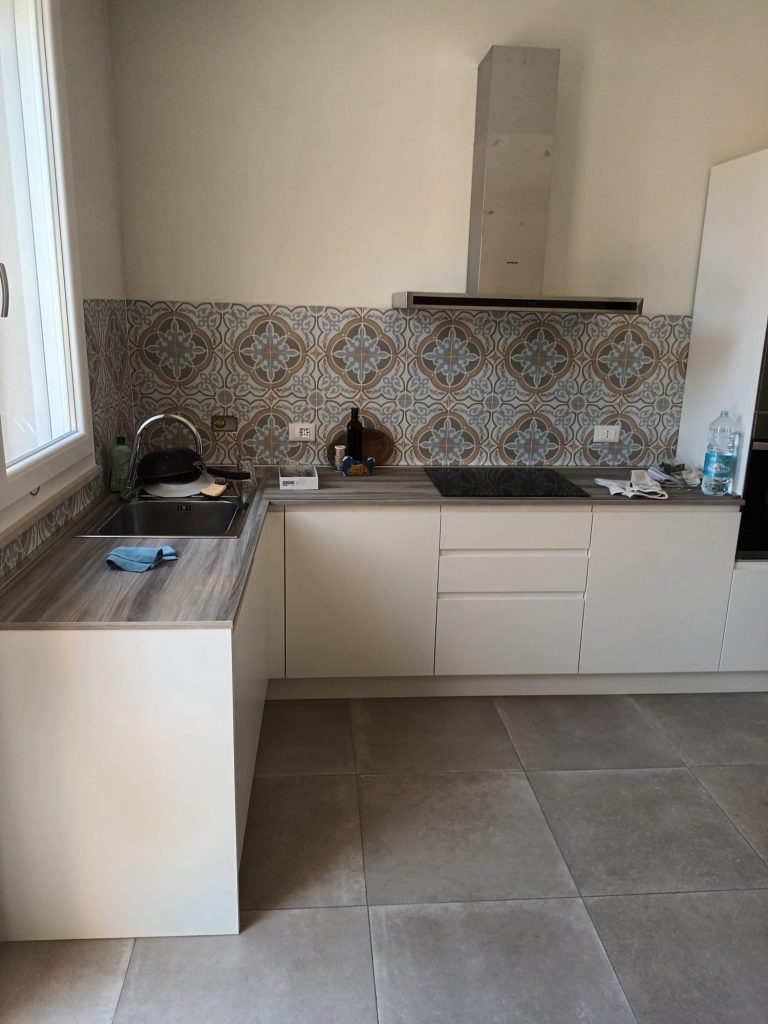 In questa cucina Punto Ceramica ha fornito due elementi distintivi che dialogano tra loro con eleganza: un pavimento in gres porcellanato effetto cemento di grande formato e un rivestimento decorativo in stile cementina dal gusto retrò.