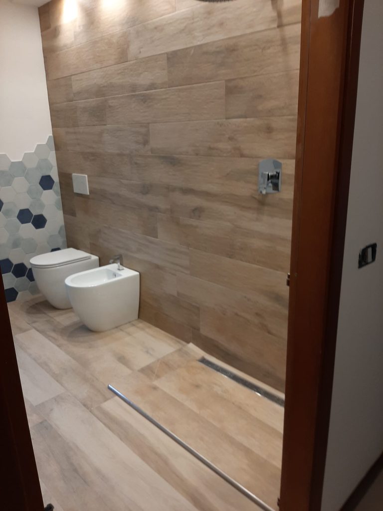 Il pavimento e la parete principale della doccia sono rivestiti in gres effetto legno chiaro, una scelta sempre attuale che dona continuità visiva e calore all’ambiente. La zona doccia è caratterizzata da un piatto rialzato filo fuga, realizzato con la stessa piastrella del pavimento, delimitato da profili in acciaio e completo di griglia a scarico lineare. L’assenza di vetri o box visibili – a volte definita “doccia walk-on” – restituisce una sensazione di apertura e pulizia formale.