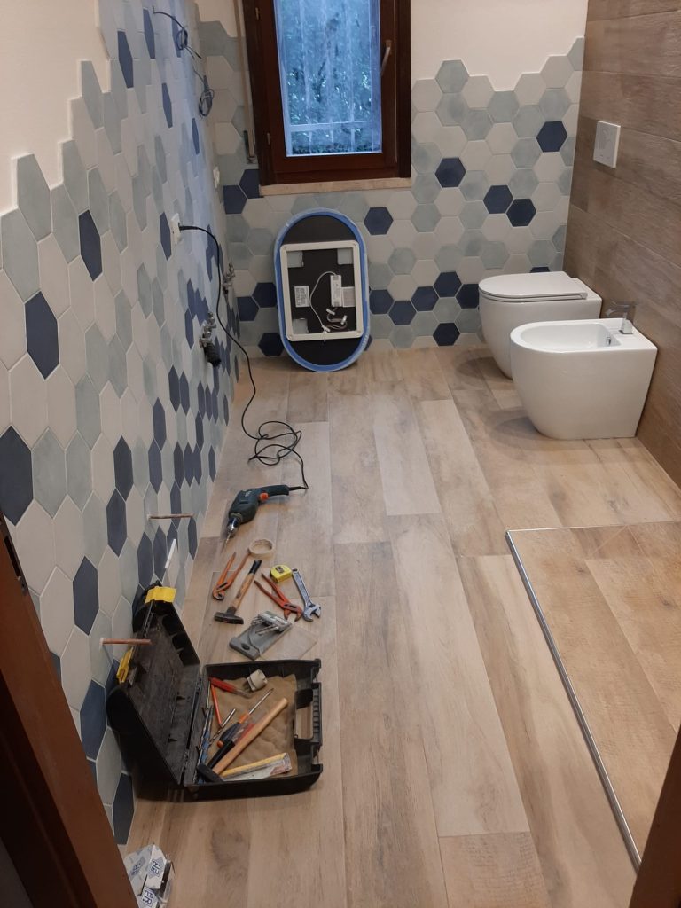 Le piastrelle esagonali – trend confermatissimo anche nel 2025 – rappresentano una delle scelte più apprezzate per chi vuole dare un tocco decorativo al bagno senza ricorrere a decori stampati. In questo caso, la posa sfalsata e la varietà cromatica creano un ritmo visivo che accompagna elegantemente l’intera parete fino all’area lavabo.