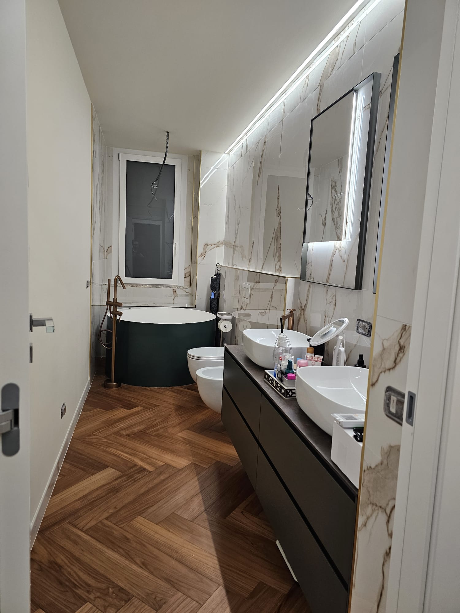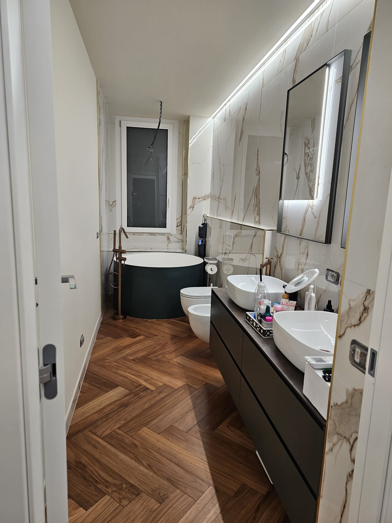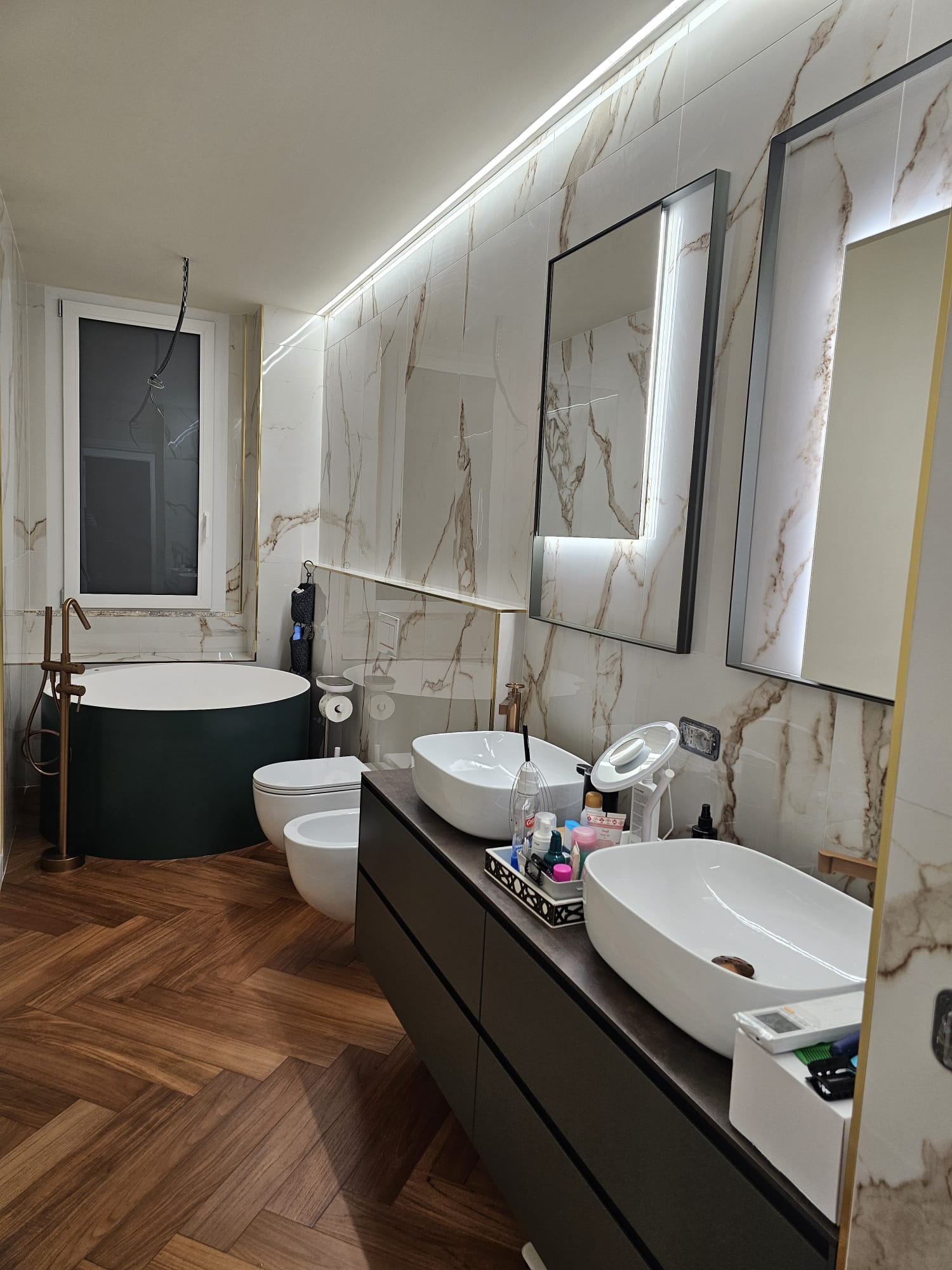 Le pareti sono rivestite con grandi lastre in gres porcellanato effetto marmo, dalla finitura lucida e venature dorate: un materiale resistente e raffinato, perfetto per chi cerca un’estetica di lusso senza rinunciare alla praticità. Il pavimento, sempre in gres, richiama invece la naturalezza del legno posato a spina di pesce: una scelta calda e accogliente, che regala movimento e personalità all’ambiente.